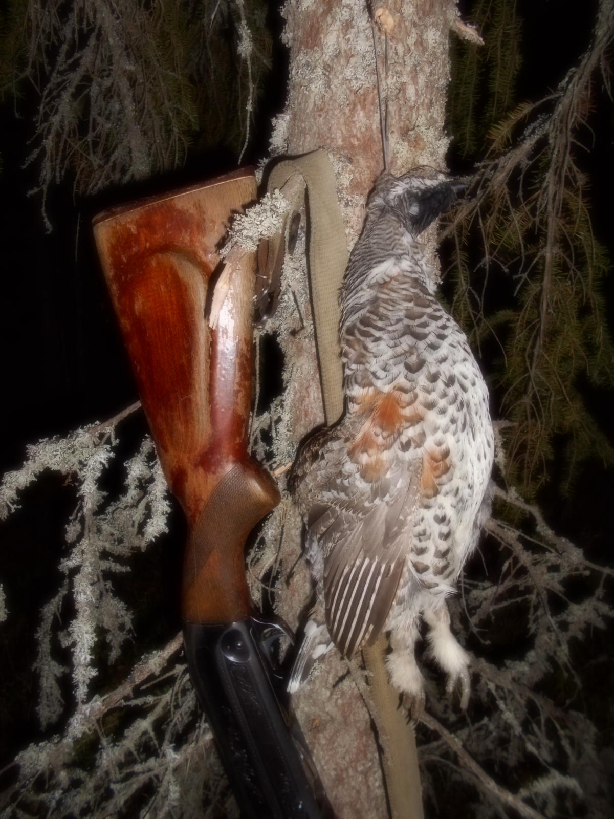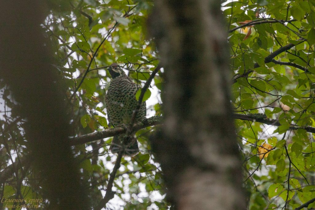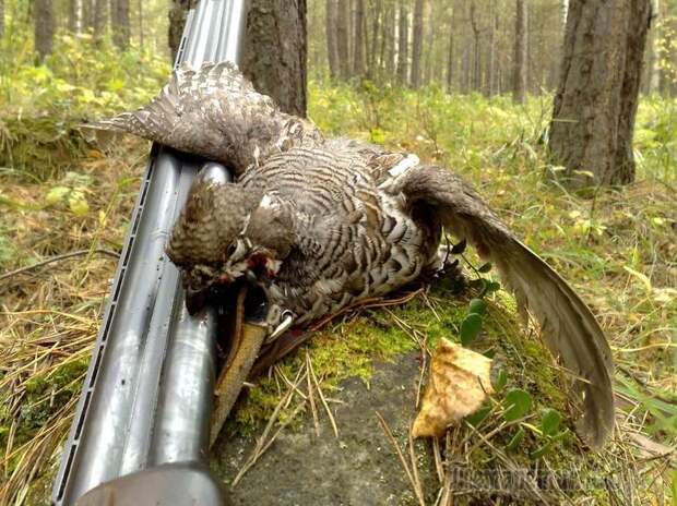 затаившегося на дереве рябчика и стреляет его.