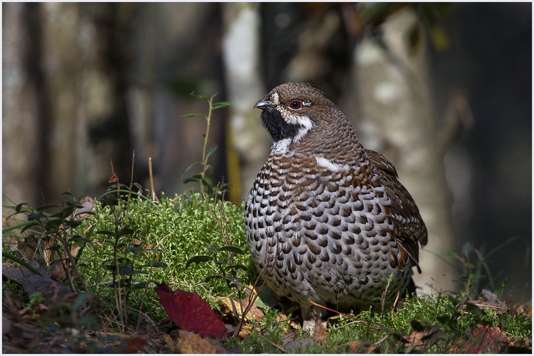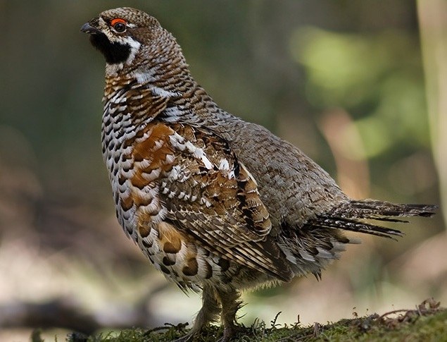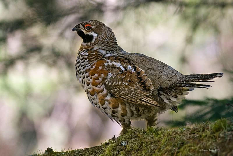 Рябчик   — мелкая птица из семейства куриных. Вес самца около 500 граммов, вес самки несколько меньше. Оперение пестрое — сочетание серых, бурых, черных, рыжих и белых пятен. Самец отличается от самки наличием на подбородке и горле черного пятна, в остальном очень схож с нею.