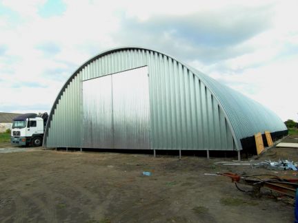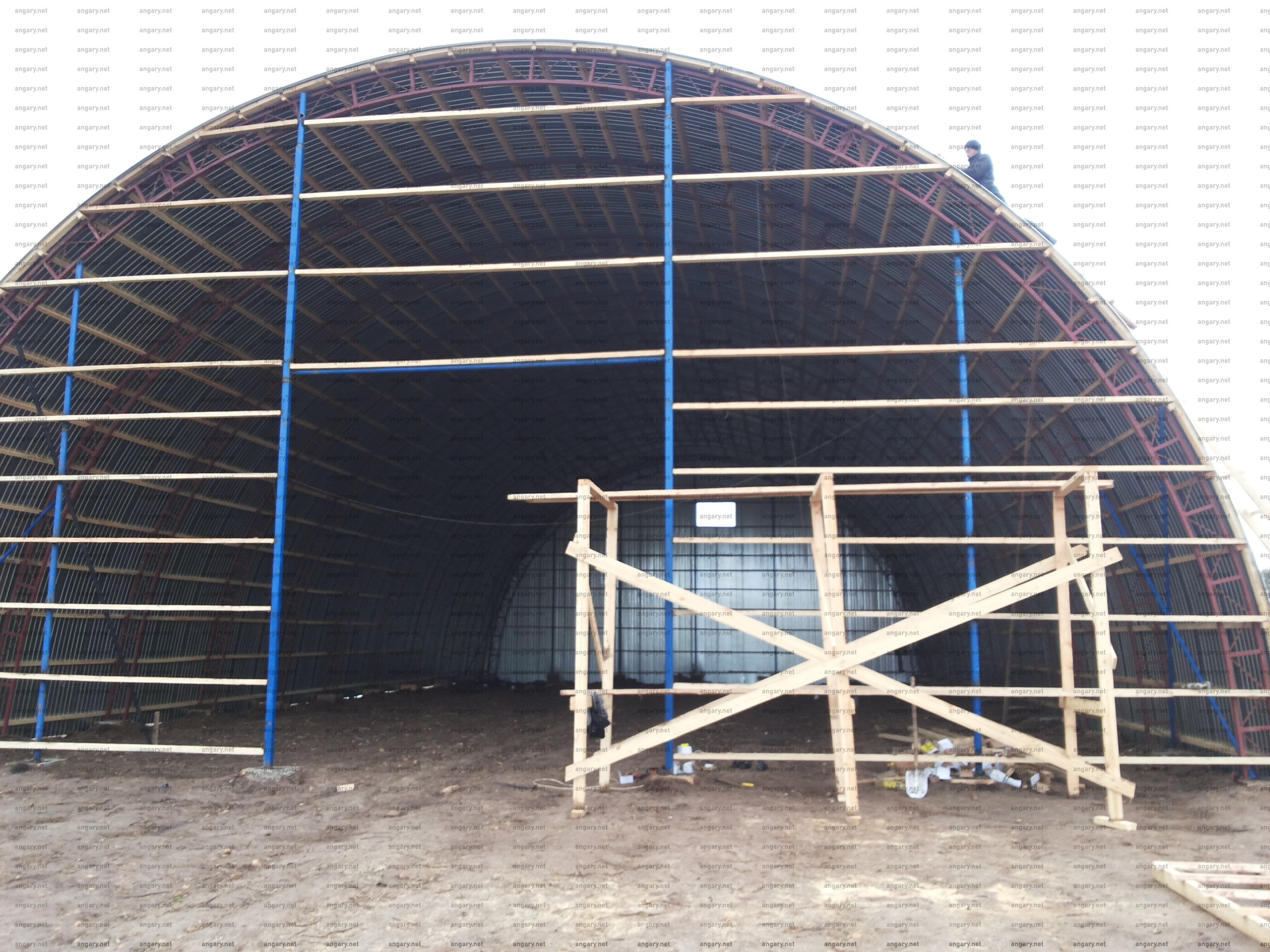 Этот вид ангаров является модификацией арочных ангаров. Но они могут иметь как форму половины эллипса, так и полукруга с вписанными в окружность прямыми балками каркаса, который является обязательным для этого вида металлических ангаров. Поэтому высота и ширина этих ангаров не так жестко связаны между собой. Но для надежности конструкции принято брать высоту в 1/2, 1/3 или 1/4 от ширины ангара.