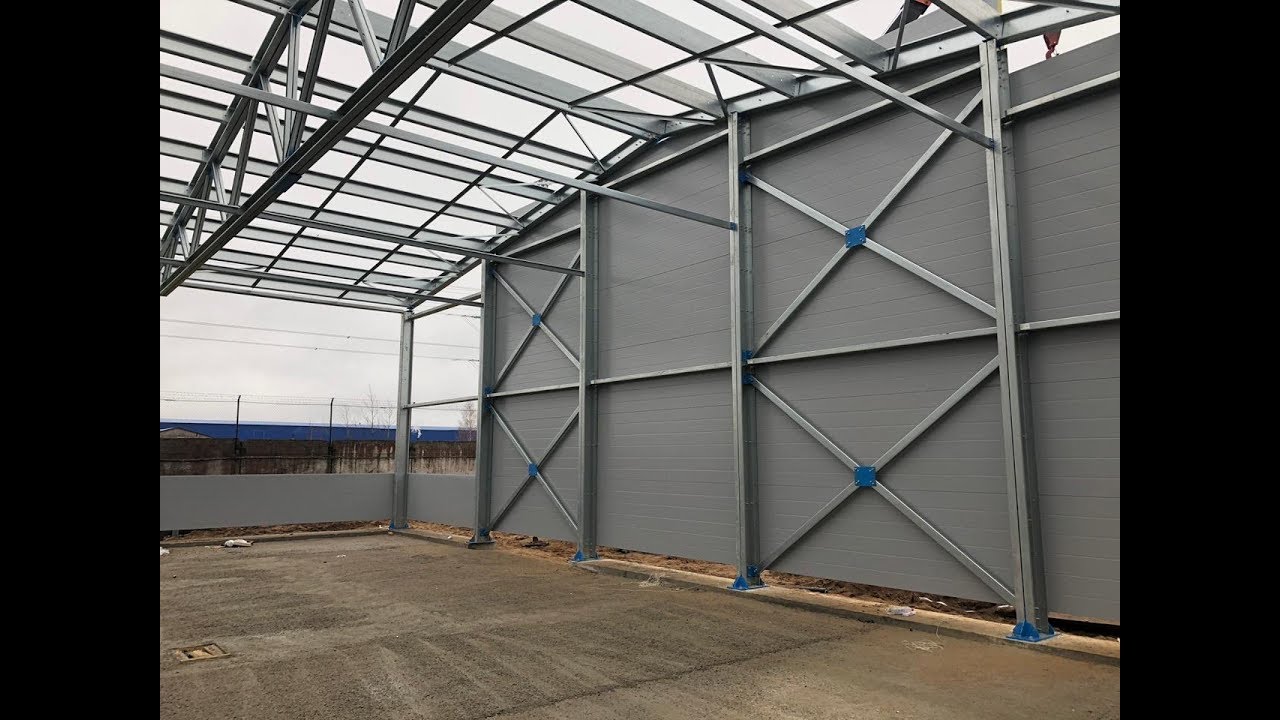 Обычно для каркаса используют уголки, швеллера и двутавры из стали марки С245 или выше. Жесткость самой конструкции обеспечивают вертикальные, горизонтальные и ветровые связи, поперечные распорки и прогоны. Обшивка выполняется полистовым способом, тентом, профнастилом или сэндвич-панелями.