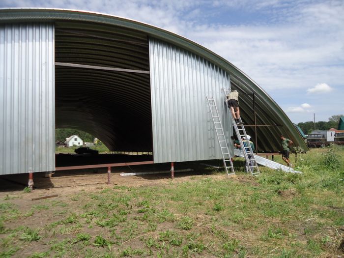 По завершению обшивки ангара остается лишь проложить все необходимые коммуникации, сделать вентиляцию, канализацию и водоснабжение. Металлические ангары не зря относятся к категории быстровозводимых зданий. На их установку уходит в разы меньше времени в сравнении с обычными домами, что делает их столь привлекательными в роли складов или зернохранилищ. А при необходимости можно довольно легко обустроить внутри административные помещения.