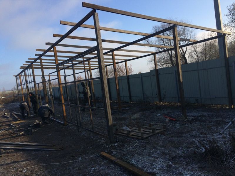 Также можно полностью собрать на ровном участке земли всю раму, которая будет состоять из двух колонн и фермы. А затем с помощью крана останется поднять и поставить её на место. Чтобы установленная рама не завалилась, до тех пор, пока не будет установлена еще одна такая же, её необходимо зафиксировать растяжками. Как это делается, можно увидеть на демонстрирующем конструкцию металлического ангара фото.